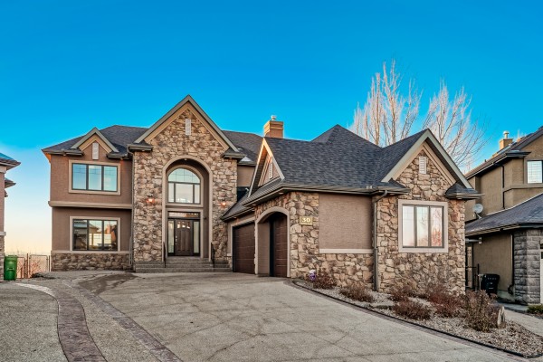 The exterior has been equally refined with upgraded stucco, newer garage doors, and 2023 professional landscaping with roughed-in irrigation. The heart of this home is the world-class location featuring unmatched vistas of the Bow River Valley and the Rocky Mountains. A stunning new sunroom serves as a private gallery for nature, providing an incredible space to soak in iconic sunsets. Inside, the grand foyer leads to a main floor designed for entertaining, featuring massive windows and a chef’s kitchen with Wolf, Sub-Zero, and Miele appliances. A two-story, double-sided fireplace anchors the formal living area, while a private executive office offers custom built-ins.